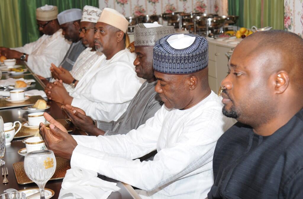 Check out the President of Nigeria, Goodluck Ebele Jonathan breaking the ramadan fast this evening with Vice President Alhaji Sambo, PDP party Chairman and senior govt officials. Not that His Excellency just went to "feast" at the "iftar", yes he did fast as well!!!